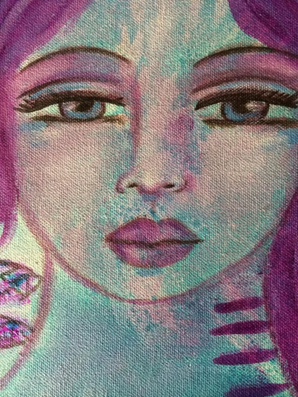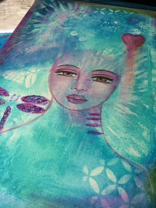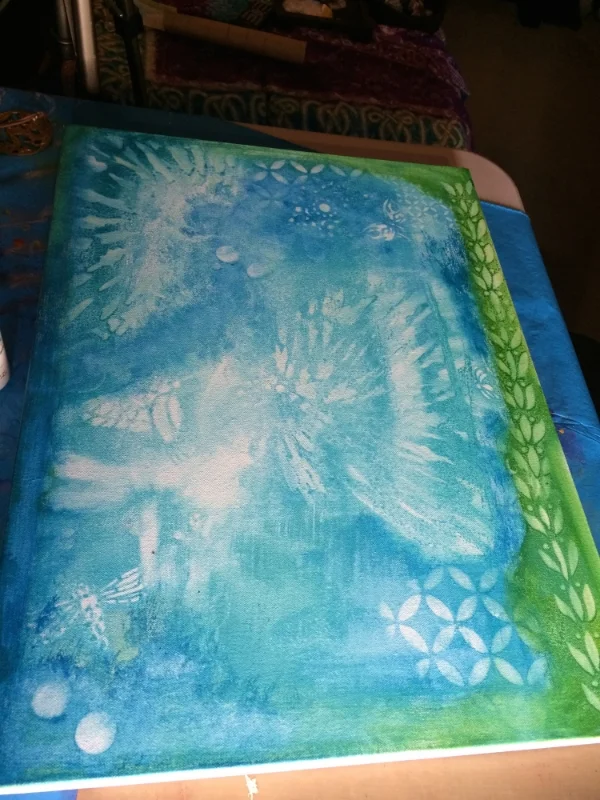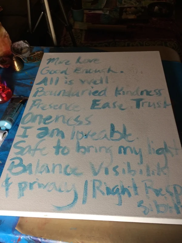 I start by sitting with the session, re-reading the notes, lighting a candle, gathering crystals near the area I will be working. I paint the intentions this woman has give me right on the canvas. I play with color and images and allow myself to just let go.